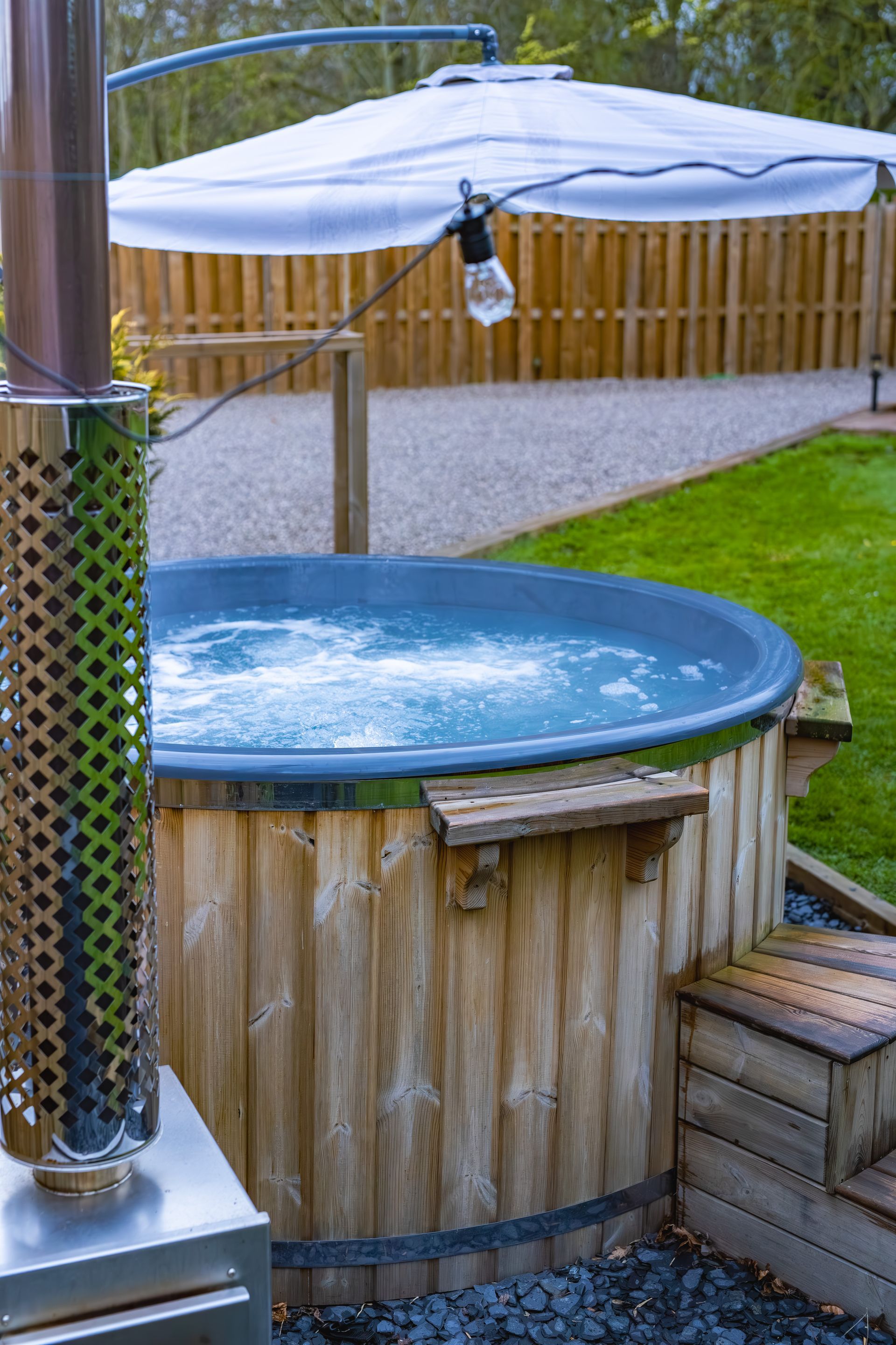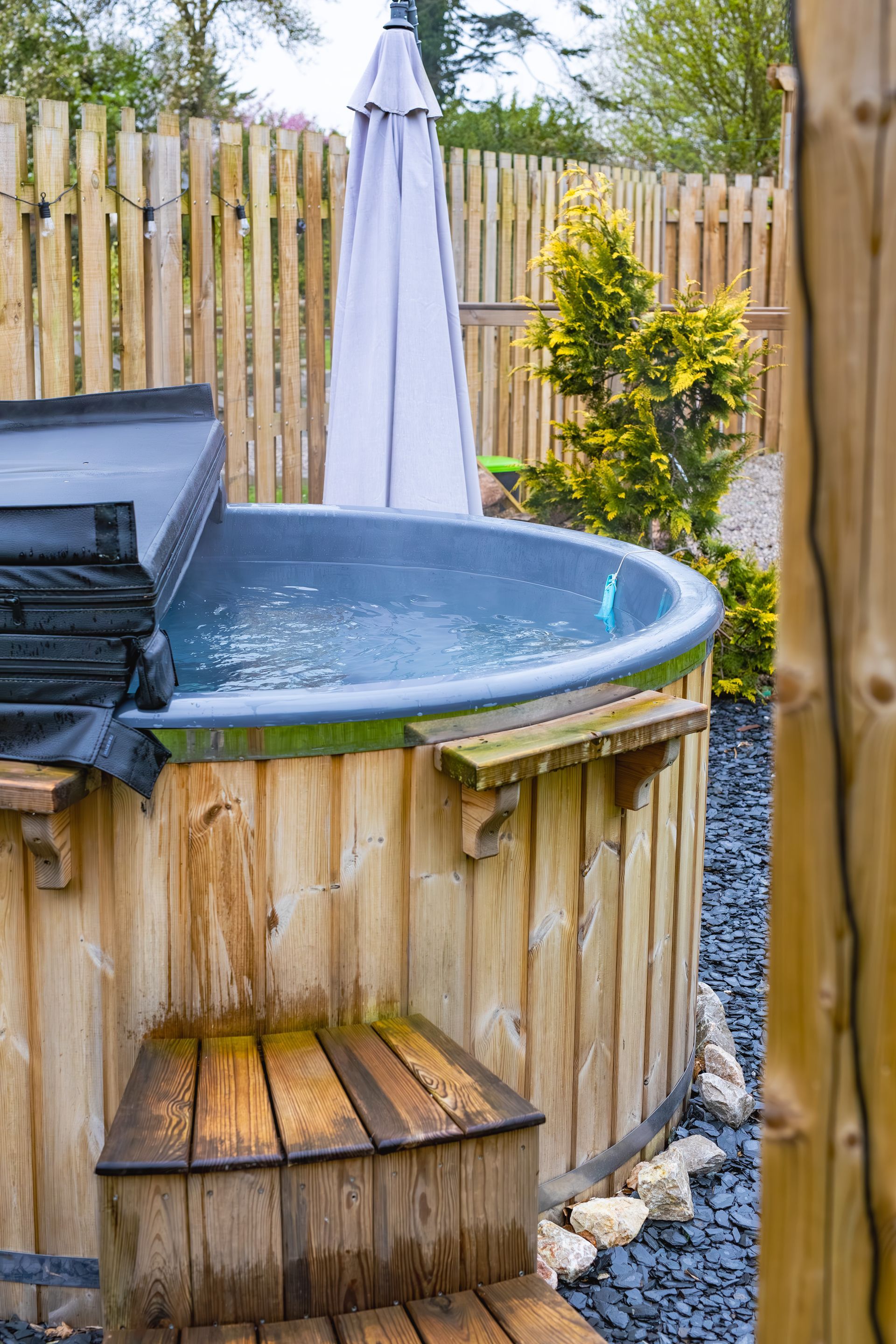 Imaginez-vous plongé dans un bain nordique chauffé au feu de bois, déjà chaud à votre arrivée. La nuit, la guirlande lumineuse crée une atmosphère chaleureuse et romantique.