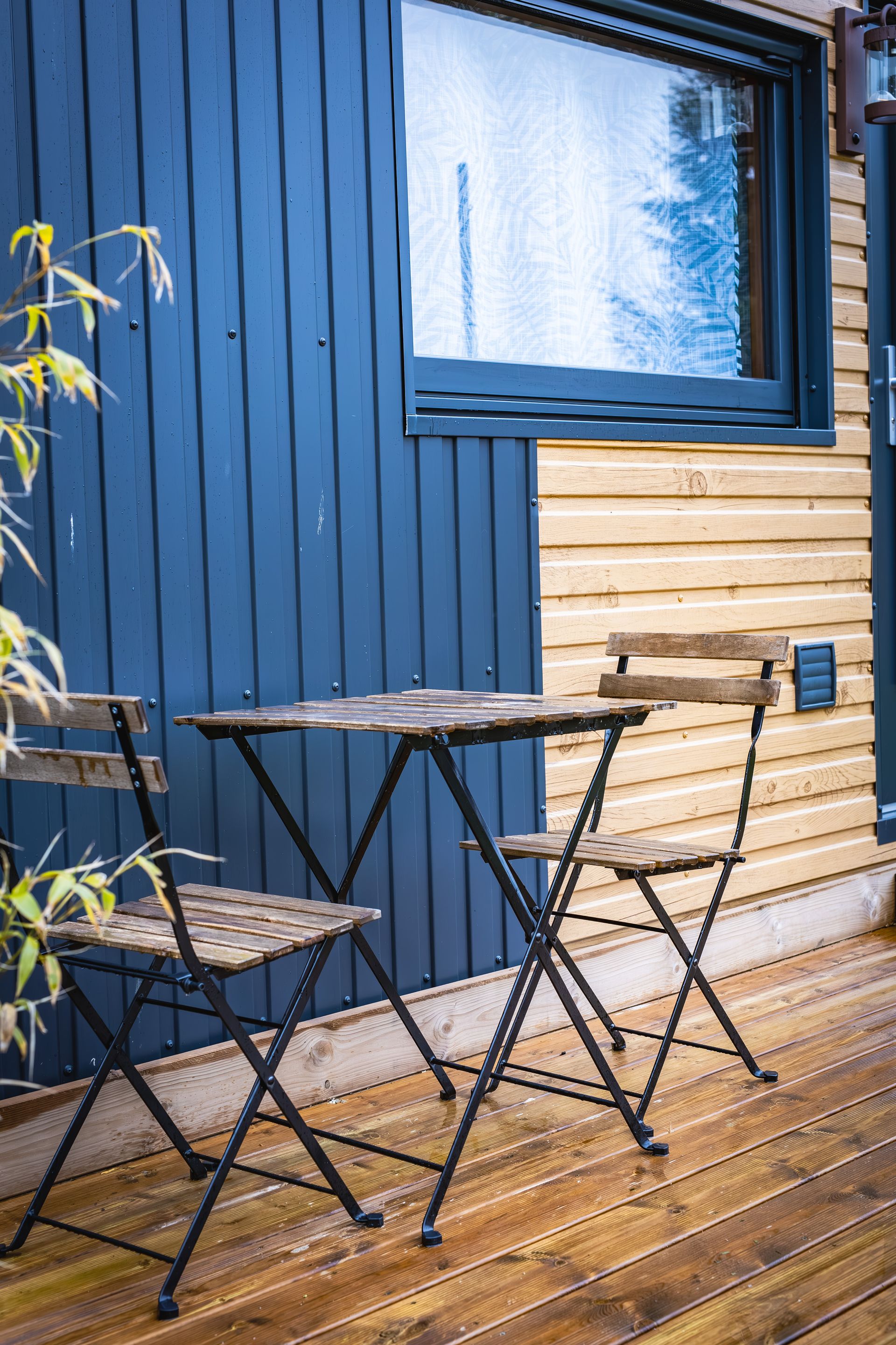 La Tiny House Exiguë vous accueille dès 16h, quand la lumière se fait plus tendre et que la nature murmure ses premières invitations au repos.